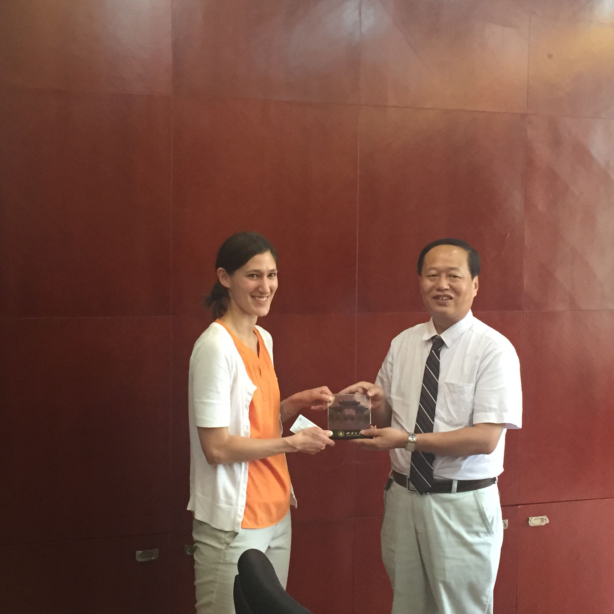 bw必威西汉姆联官网院长何有节教授向Jessica赠送礼物