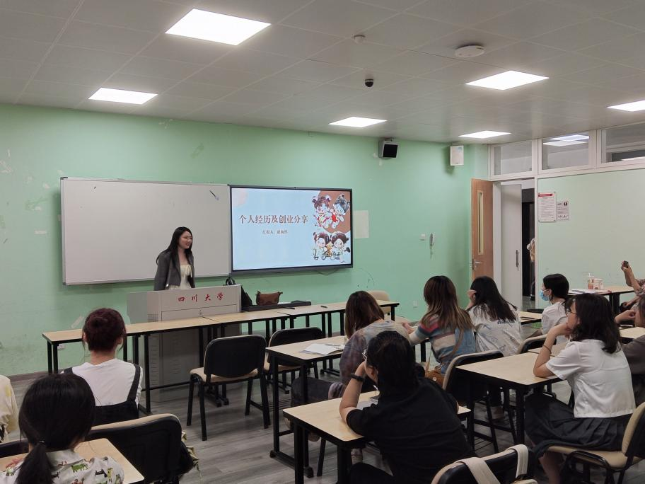 赵婉彤是2018级本科生,保研本校,她介绍了自己在本科期间就开始准备的创业项目。她对潮玩行业发展现状进行了分析,并从潮玩行业中选择了棉花娃娃这一品类开始了自己的的创新创业计划。她从主营品类、产品模式和衍生成人衣物来简要介绍了自己公司的基本情况。最后她热情邀请有兴趣有能力的同学加入她的公司,承担设计助理的工作。
