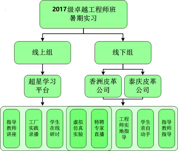 因今年6月北京新发地爆发疫情,原定于河北辛集锚营制革区的实习活动不得不取消,仅保留了福建漳浦皮革工业园的实习计划。根据学生所在区域的疫情风险等级,将41名同学分为“线下组”和“线上组”。“线下组”主要采取传统的导师带队到企业实习的模式进行;“线上组”通过网络讲座、仿真实验等方式开展。两组交叉融合,开启了“线上线下混合实习”的新模式。