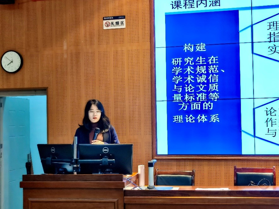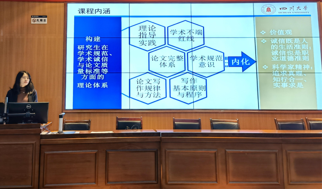 为贯彻落实《关于进一步规范和加强研究生培养管理的通知》、《四川大学关于加强学术诚信体系建设的实施办法》和《四川大学进一步加强研究生学术道德与学风建设的实施方案》文件要求,积极响应《关于开展四川大学诚信教育教学课件展示及优秀主讲教师评选活动的通知》文件要求。2021年11月2日晚19:30,尚娇娇老师于研究生院2区101讲授了《学术规范与研究生论文写作指导》课程,现场共有百余名硕士研究生和博士研究生进行学习。