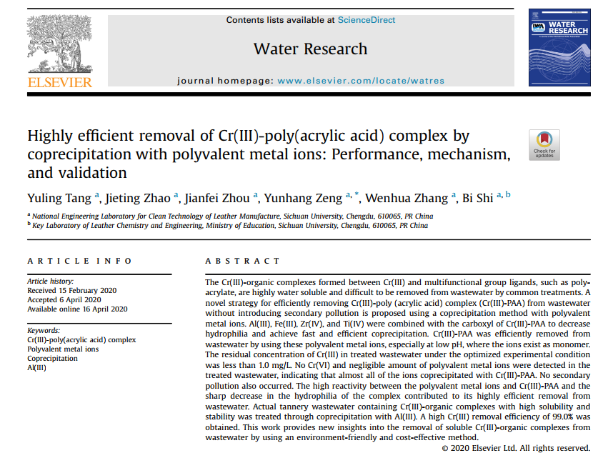 近日,bw必威西汉姆联官网生物质与皮革工程系石碧院士课题组在由国际水协会(IWA)主办,针对全球水污染修复及水环境管理的著名学术期刊Water Research(Nature Index期刊)上发表了题为“Highly Efficient Removal of Cr(III)-poly(acrylic acid) Complex by Coprecipitation with Polyvalent Metal Ions: Performance, Mechanism, and Validation”的研究论文。论文第一作者为专职博士后唐余玲,通讯作者为曾运航副教授。