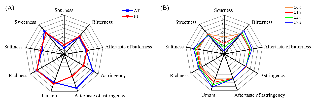 儿茶素,尤其是表没食子儿茶素没食子酸酯(EGCG表儿茶素没食子酸酯(ECG是茶叶苦涩味的最主要来源。秋茶经冠突散囊菌PW-1发酵后,儿茶素总量从118.35 mg/g下降到10.58 mg/g下降幅度达 91.06%;且发酵秋茶中酯化儿茶素EGCGECG的含量分别为0.37 mg/g0.40 mg/g,表明菌株PW-1发酵可显著降低秋茶中的儿茶素含量。通过电子舌技术对秋茶和冠突散囊菌PW-1发酵秋茶的滋味特征进行分析,发现秋茶的涩味显著降低而鲜味强度有所增加,表明秋茶经菌株PW-1发酵后的滋味品质得到显著提高。此外,通过电子舌技术首次对茶褐素的滋味特征进行分析,发现茶褐素无涩味而呈强烈的鲜味,为发酵秋茶中的主要呈味物质。