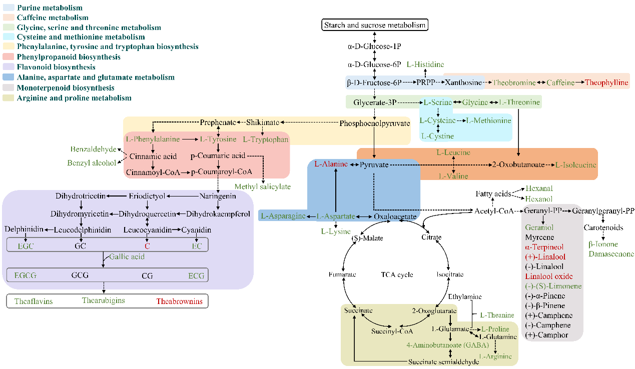 GC-MS分析结果显示,秋茶中醇类挥发性成分的含量在冠突散囊菌PW-1发酵后显著增加,其中呈花果香味的(Z)-芳樟醇氧化物、芳樟醇、(E)-樟醇氧化物(呋喃型)和 1-辛烯-3-的含量最高,表明菌株PW-1显著提升了秋茶的香气品质。代谢途径分析结果显示,冠突散囊菌PW-1提升秋茶品质主要与丙氨酸、天冬氨酸和谷氨酸代谢途径,甘氨酸、丝氨酸和苏氨酸代谢途径,氨酰-tRNA 生物合成途径,精氨酸生物合成途径以及精氨酸和脯氨酸代谢途径的表达相关。