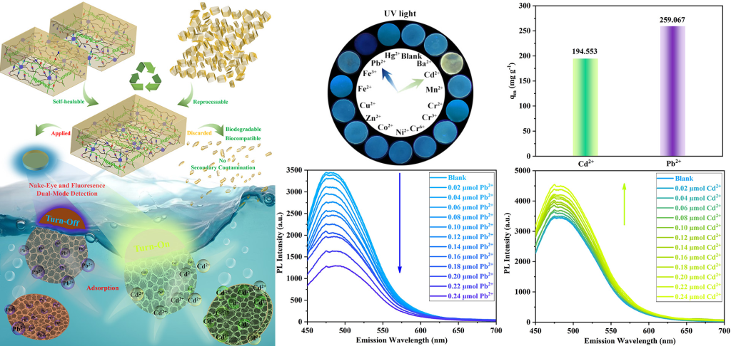 研究团队通过精心的设计,利用甲基丙烯酸缩水甘油酯对课题组先前所报道过的石墨烯量子点进行了功能化修饰以利于其能够稳定地共价交联固定到凝胶基材中,并通过合理的选择生物质明胶和生物源硫辛酸作为双重网络构建了如上图所述的凝胶材料。该凝胶在吸附镉离子/铅离子后,石墨烯量子点的荧光会出现相应的增强/猝灭,而明胶的荧光却不会发生明显的改变,致使凝胶在吸附镉离子/铅离子后会呈现出青色至黄绿色/蓝紫色的荧光颜色转变并伴随明显的荧光强度变化,从而首次实现了同时灵敏裸眼/荧光双模式检测镉离子和铅离子,对镉离子和铅离子的检测线性范围可控制在0.02-0.24 μmoL之间。同时,由于含有大量的活性吸附位点,该凝胶还能够有效的吸附水中的镉离子和铅离子,最大吸附容量分别可达194.553259.067 mg/g,均超过了先前报道的凝胶吸附材料。此外,该凝胶具有优异的自愈能力、可再加工性、生物降解性和生物相容性,在实际应用中可延长其使用寿命并可防止其在弃用时造成二次污染。本研究不仅为同时灵敏检测和有效去除水中的镉离子和铅离子开发了一个多功能平台,而且为未来研究制备用于监测和净化重金属污染水的多功能材料提供了一种创新性设计策略。