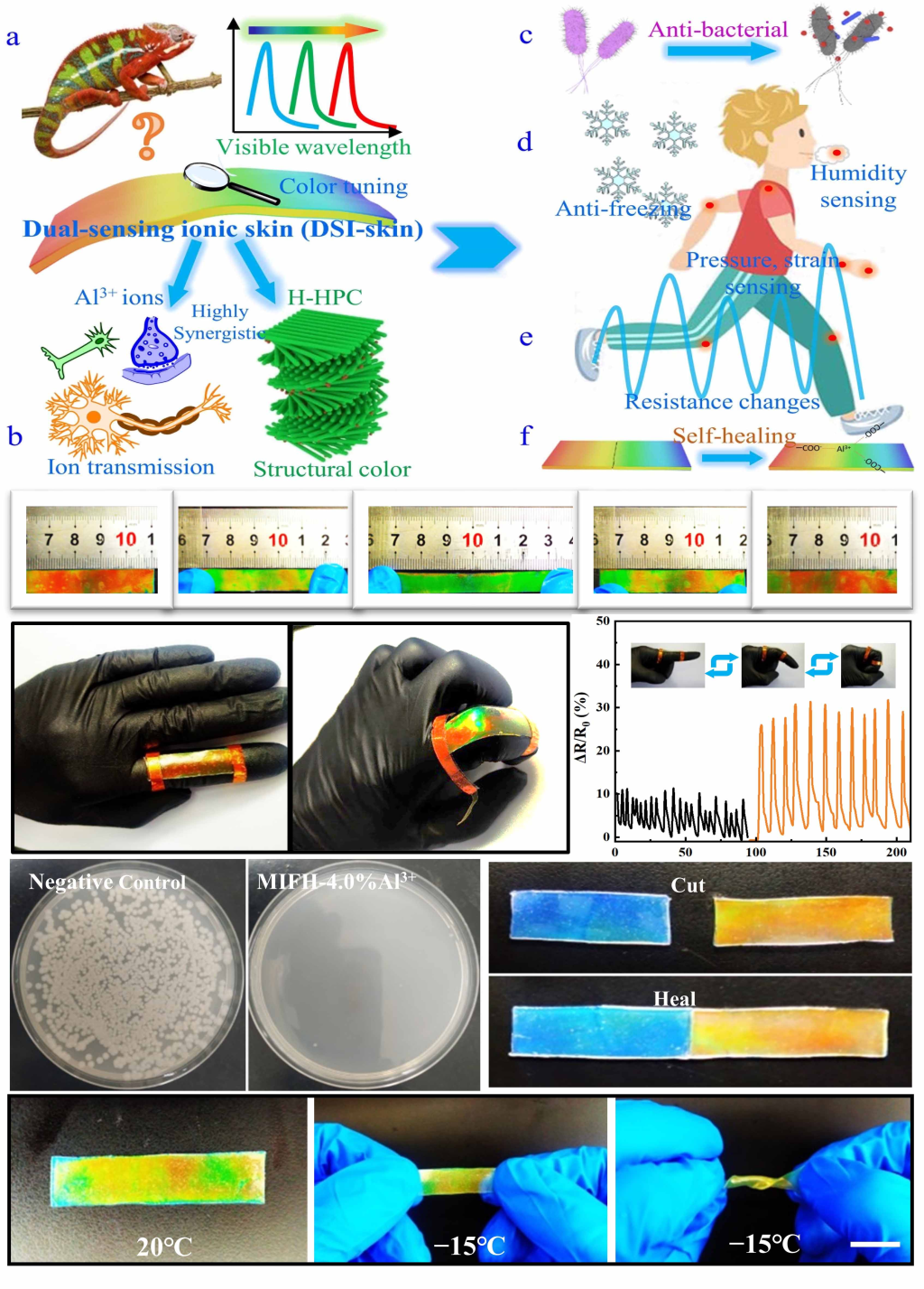 1. 具有多重监测、抗菌、自愈合、防冻功能的机致变色/机电响应的光电双传感离子皮肤(DSI-skin)