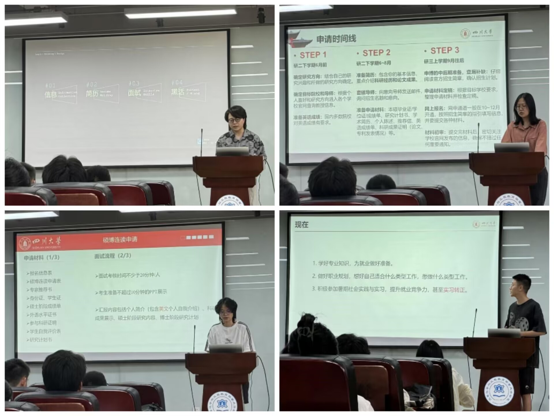 紧接着,成功考取宜宾紧缺选调的2021级食品工程专业硕士研究生朱美淋同学、成都紧缺选调的2021级轻工技术与工程专业硕士研究生唐银同学与成都选调岗位的2021级食品工程专业硕士研究生张彤同学从考公方面展开分享,对同学们普遍关心的选调、国考、省考等公务员考情进行了分析,详细介绍了应该如何高效地准备行测、申论、专业课等在内的考试内容,并提出在面试环节应大方得体,不可过度紧张。同时,他们也建议大家在备考时可以在能力范围内多参加考试,从实践中摸索经验,增大上岸概率,做到灵活选择。