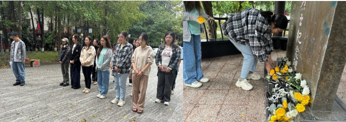 活动开始,全体同学面向革命烈士纪念碑垂手肃立,潘磊同志向大家介绍了革命烈士纪念碑的历史:为纪念建立新中国英勇牺牲的川大师生而建,纪念碑背面刻有张培爵、王右木、恽代英、杨闇公、李正恩、江竹筠等四十多位曾经在川大学习和工作过的革命烈士的名字,潘磊同志带领大家一同学习革命先烈王右木为理想和大义鞠躬尽瘁的感人事迹以及一心向党、大公无私的伟大精神。
