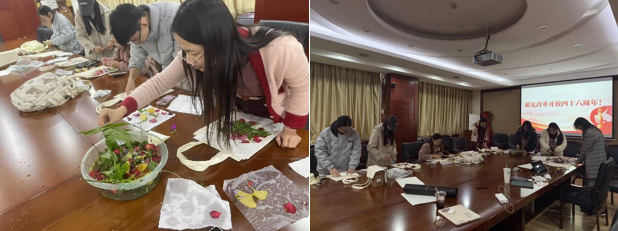 随后,胡熏允同志以“献礼改革开放46周年”为主题,带领大家学习并实践传统手工艺术“草木染”,巧妙地将红色教育与传统文化相融合。胡熏允同志从草木染的历史渊源、文化价值、艺术价值、生态价值、草木染在新时代的发展、草木染的种类几个方面带领大家全面认识草木染,并详细讲解了草木染中敲拓染这一技法。紧接着,全体党员进入草木染环节。党员们从亲手采集的校园内的各类植物叶片与花朵中挑选素材,设计图案布局,运用敲拓染传统技艺,让植物的汁液渗透到织物上,将自然之美定格在帆布包上。这一过程不仅锻炼了党员们的创造力和动手能力,更让大家在亲近自然、感受传统文化魅力的同时,体会到耐心、专注与坚持的重要性,如同每一位党员都需秉持这样的品质,扎实走好每一步。活动过程中,党员们相互交流、协作互助,在一片欢声笑语中完成了一件件饱含心意与创意的敲拓染作品。这一过程,不仅是艺术实践,更彰显了党员们对时代发展与文化传承的深刻感悟与担当。