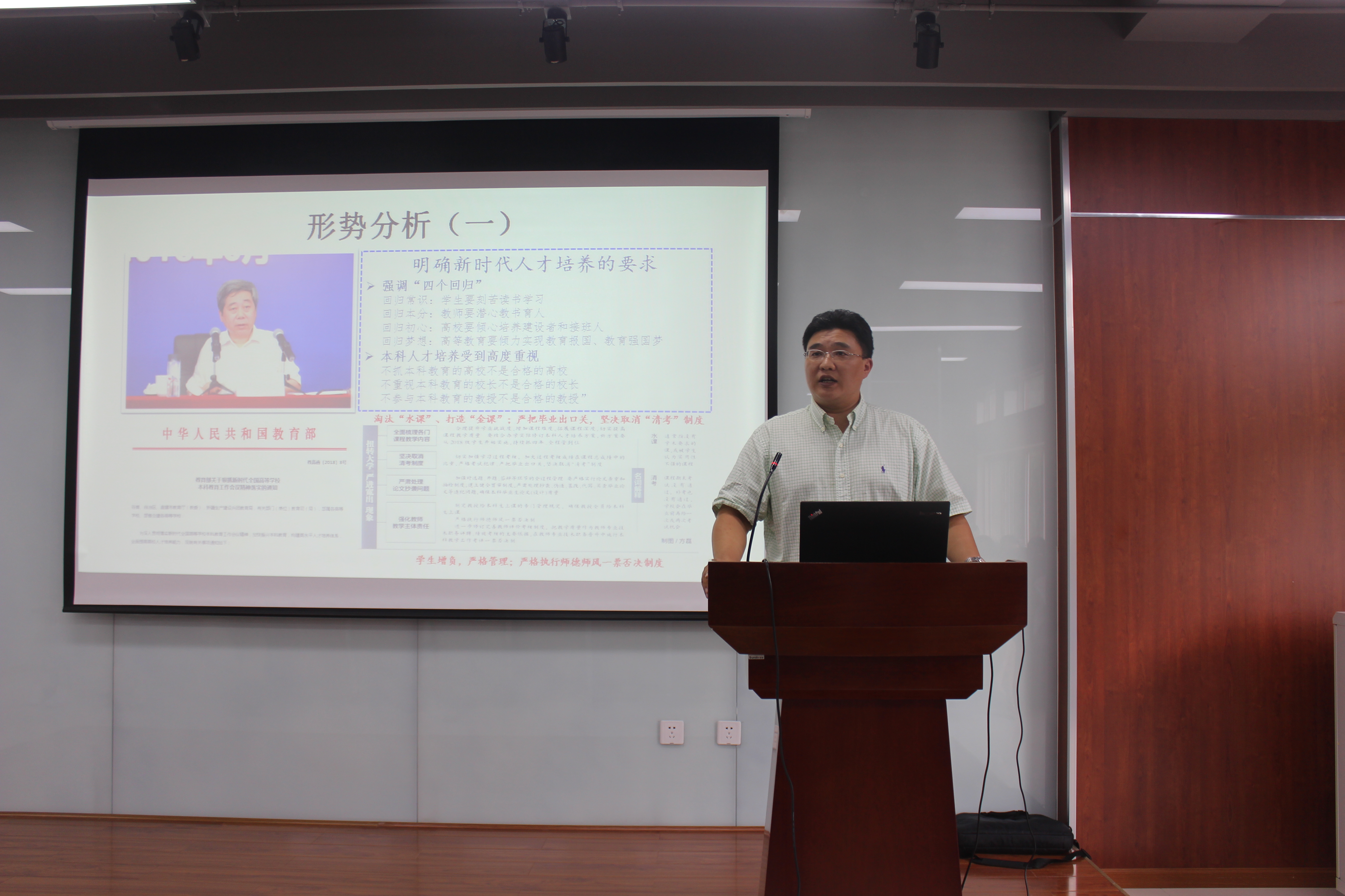 刘书记首先向全院教师传达了学校新学期工作会议的精神。同时结合“党建与业务工作实现深度融合、有效推进目标管理制、核心工作板块呈现起色、局部工作形成引领”等四个可喜局面,对学院的前期工作进行了总结;并从“保生存、保效益、保稳定、保发展”等四个维度提出学院的未来发展战略。最后刘书记结合国家、学校的大政方针,就当前的形势发展做了分析,向全体教师提出了“要明确新时代人才培养的要求”、“要关注新时代科研成果认定、人才评价标准的发展方向”等具体要求。