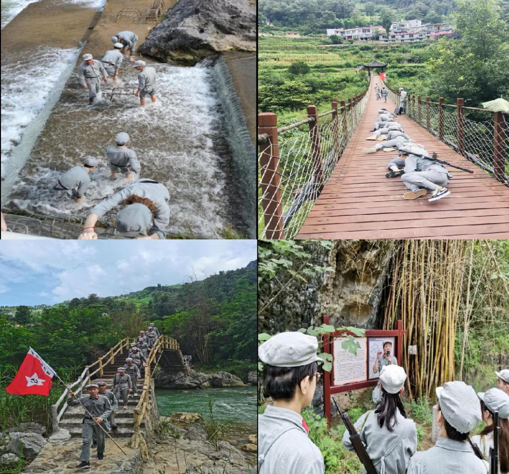随后,实践团成员在专业人员指导下,开启了重走四渡赤水红军路重温铁血忠魂红军情的行程。实践团成员团结协作、勇往向前,最终共同完成了四渡赤水浮桥搭建、匍匐渡河作战、急行军过草地、奋勇向前抢要塞等项目,真实体验红军长征渡河的艰辛和在泥泞和坎坷中一步步走向胜利的不易每到一个渡口,实践团成员认真倾听体验营专业人员关于苟坝会议、白沙会议、攻打云庄等一幕幕历史画面的生动讲述,在“实战”和“授课”中深刻领会红军长征精神,在一首首激昂的红歌声中入脑入心,坚定信念跟党走。