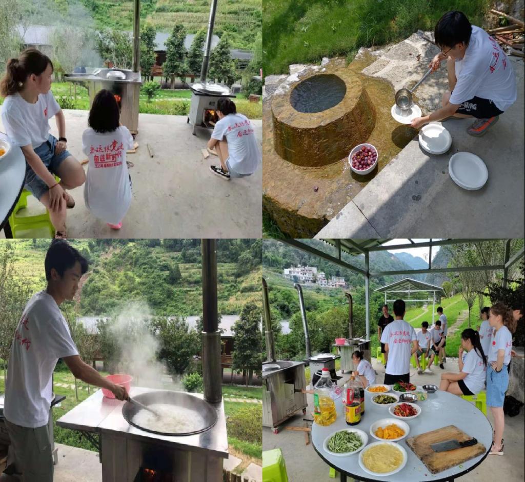 实践团成员埋锅灶饭红军餐