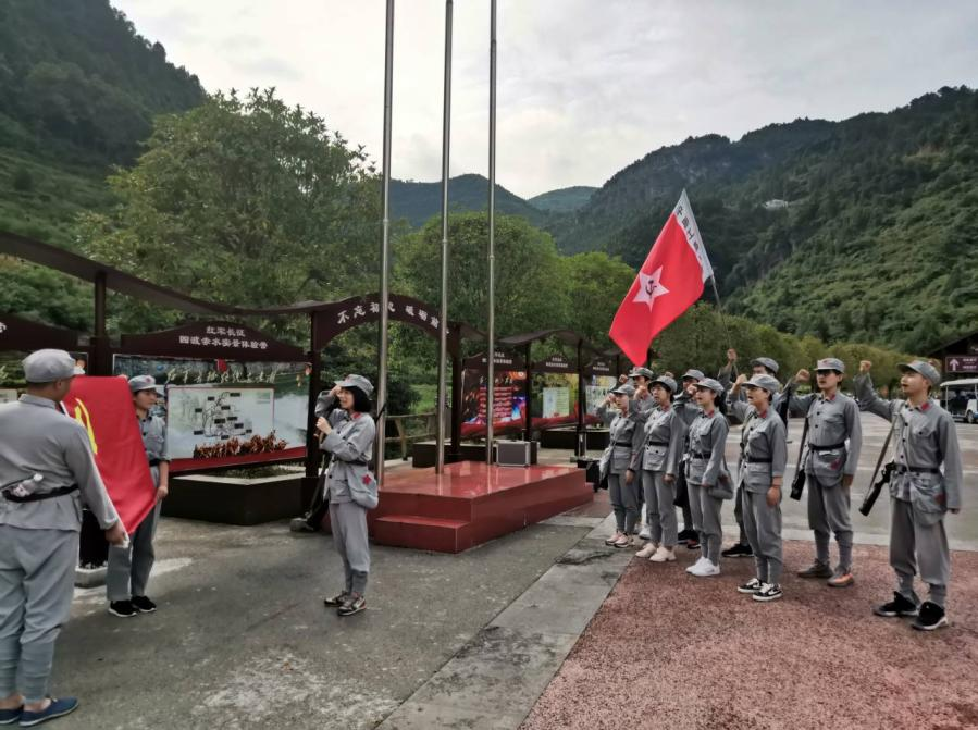 2021年7月25日上午,迎着晨风,映着朝阳,红军长征在古蔺四渡赤水画面一幕幕清晰浮现在眼前,实践团成员统一换上行军服装,李艳老师带领大家重温了入党誓词。实践团成员举起右拳在党旗下庄严宣誓,“我志愿加入中国共产党……宣誓人……”,誓词铿锵有力、初心永恒。