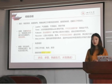 进入企业工作的毕业生也结合自身经历为同学们讲述了企业的招聘流程和面试注意事项。覃凤阳同学通过了五粮液公司的层层选拔,她强调了企业对专业知识的高标准要求,除了对逻辑推理和资料分析等知识性考核外,还会测试对企业文化的了解程度。进入外企就职的蓝绪悦同学讲述了群体面试和单人面试的技巧,一定要敢于表达自己的想法,并提前准备好中英文自我介绍,对面试中可能出现的问题也要做好充足的准备。唐丽同学主要向同学们分享了两个方面的内容:一是沿海地区与西南地区选调政策的差别;二是选择就职高校辅导员的了解渠道。会上,同学们也积极向毕业生学姐们提出自己在了解就业过程中遇到的疑问。