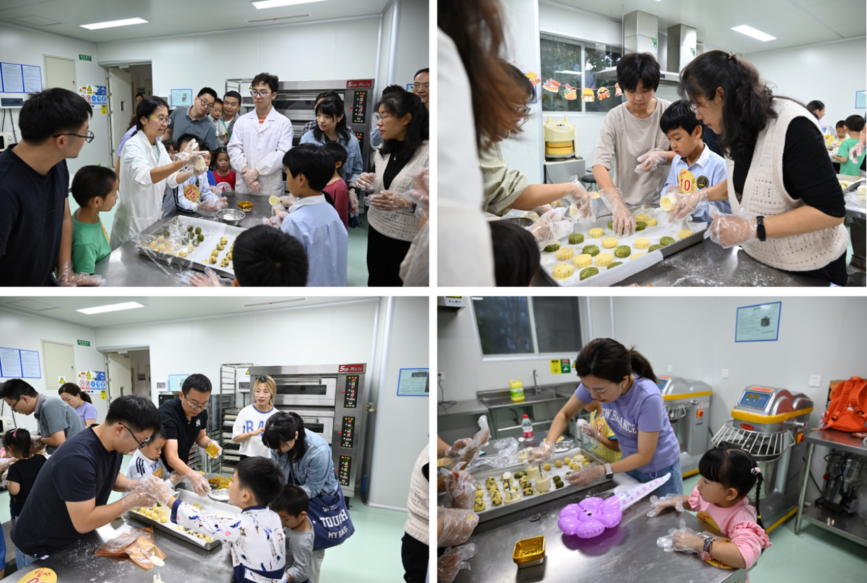 活动现场,所有家庭按照《古朗月行》中的三个意象随机分为3组:皓月组、玉兔组和桂树组,每组13个家庭开展活动。bw必威西汉姆联官网分工会副主席、食品科学与工程专业老师董怡副研究员和助教们分组教学,为大家讲解月饼制作方法和注意事项,随后教职工家庭自己制作月饼,揉皮、包馅、定型,一个个印有“川大”字样的定制月饼制作完成,大家相互展示、分享者自己的劳动成果,现场充满欢声笑语。