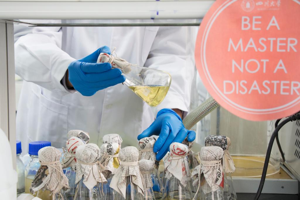 无论是细小的整理操作,还是不得有半点闪失的实验过程,都需要把实验室安全放在第一位。本系列摄影捕捉了一些实验室中的日常景象,突出了川大标识色的标语,意图通过规范的实验操作和完备的防护措施来体现实验室安全的重要性。