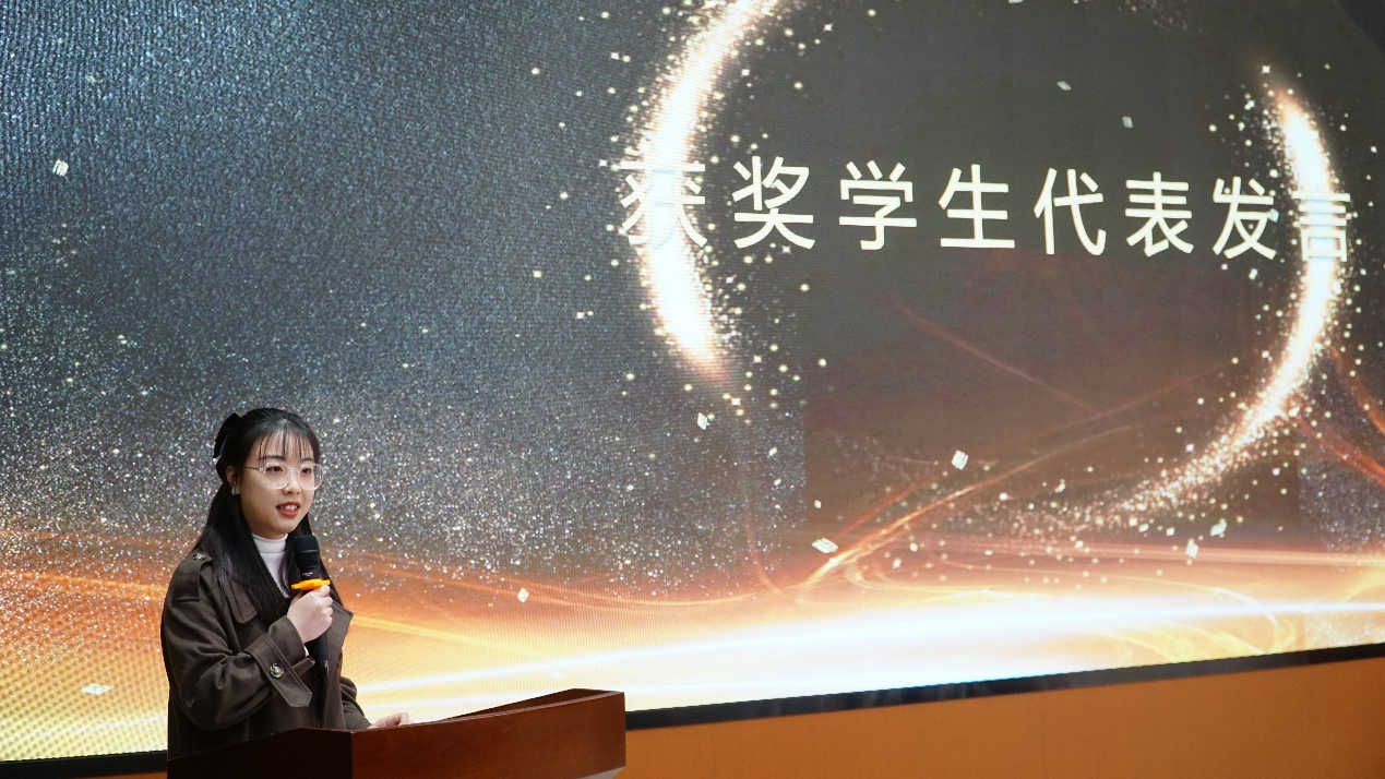 最后,2020级生物工程专业洪梦婷同学代表获奖学生发言。洪梦婷同学代表全体同学向学院、老师们和设奖单位表达最真挚的感谢。洪梦婷同学表示将传承企业和校友们“不忘初心”的精神品质,把这份荣誉转化为不竭动力,不断追求知识的进步和创新的突破,不断提高自己的综合素质和实践能力,以更加饱满的热情、更加昂扬的斗志、更加刻苦的精神、更加坚韧的毅力去面对未来学习和生活中的挑战,不负时代、不负韶华,在青春的赛道上奋力奔跑。
