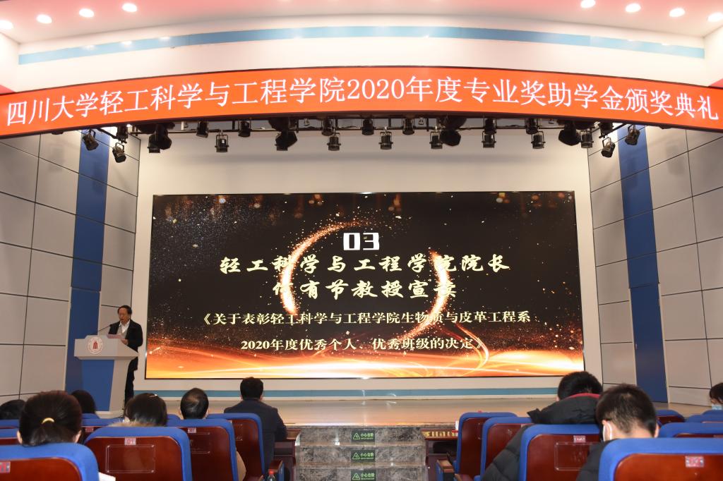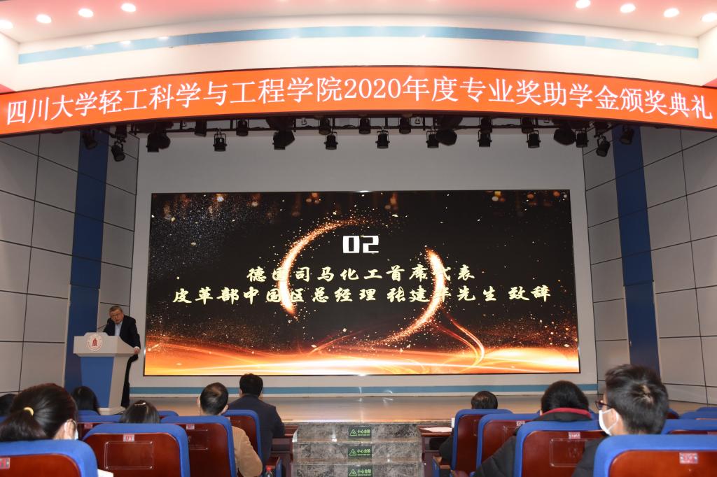 2020年12月10日,四川大学生物质科学与工程创新班奖学金、中国皮革协会奖学金、斯塔尔奖学金、美多绿奖学金、皇成奖助学金、司马创新奖学金、广东皮革校友会热爱专业奖学金、亿兴奖学金颁奖典礼在望江校区东三教报告厅隆重举行。受四川大学生物质与皮革工程系的邀请,德国司马化工首席代表、皮革部中国区总经理张建华先生、斯塔尔技术服务中心经理李艳女士、白家食品产业股份有限公司董事会秘书张琨女士参加了本次活动。出席本次颁奖典礼的学院领导有bw必威西汉姆联官网党委书记刘晓虎副教授、院长何有节教授、党委副书记冯国涛老师、副院长彭必雨教授、生物质与皮革工程系系主任林炜教授、皮革化学与工程教育部重点实验室主任范浩军教授、生物质与皮革工程系副系主任程海明教授、制革教研室主任但年华副教授、第一届生物质科学与工程创新班班主任代表副研究员以及学院学生工作组全体老师。bw必威西汉姆联官网2020年度专业奖助学金获奖学生代表参加了本次典礼,颁奖典礼由学院党委副书记冯国涛老师主持。