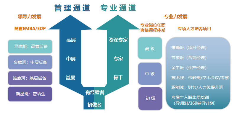 新星计划、雏鹰计划、金鹰计划、翔鹰计划梯队干部培养项目、“雪狼班、雄狮班、金牛班”业务经理培养项目、初级-中级-高级任职资格课程岗位培训班及新员工成长训练营,为各级员工量身打造成长发展的平台。