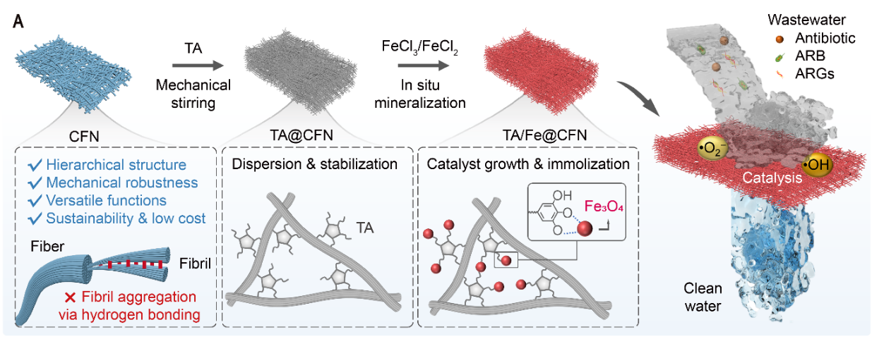 随着全球人口增长与制药业快速扩张,废水中抗生素等新兴污染物的检出频率与浓度不断攀升。这类污染物具有显著的环境持久性,难以通过自然过程实现有效降解,即便在痕量浓度下,仍会诱导微生物产生耐药性,对生态系统安全与公共健康构成严重威胁。活性炭吸附、紫外线消毒等传统污水处理技术,因对这类难降解污染物的去除效率有限,难以满足实际处理需求。当前研究中,芬顿法等高级氧化技术虽可通过生成活性氧(reactive oxygen species, ROS)实现此类污染物的降解,但这类技术往往需在反应体系中投加大量化学药剂,且存在活性成分寿命短、催化剂易团聚失活等问题,导致反应效率与处理经济性受限。纳米限域催化膜(nanoconfined catalytic membranes, NCM)的出现为破解这一难题提供了新思路:该类膜材料通过将纳米催化剂限域于多孔基体中,不仅能有效抑制催化剂团聚,还可强化 ROS 与污染物的界面相互作用,从而实现污染物的连续高效去除。然而,纳米限域催化膜的规模化应用仍面临诸多挑战:其一,复杂的制备工艺与高昂的生产成本,限制了其实际推广;其二,传统聚合物基 NCM 易出现孔道堵塞、催化剂流失等稳定性问题,且其石油基材质带来了环境兼容性与可持续性方面的深层担忧。