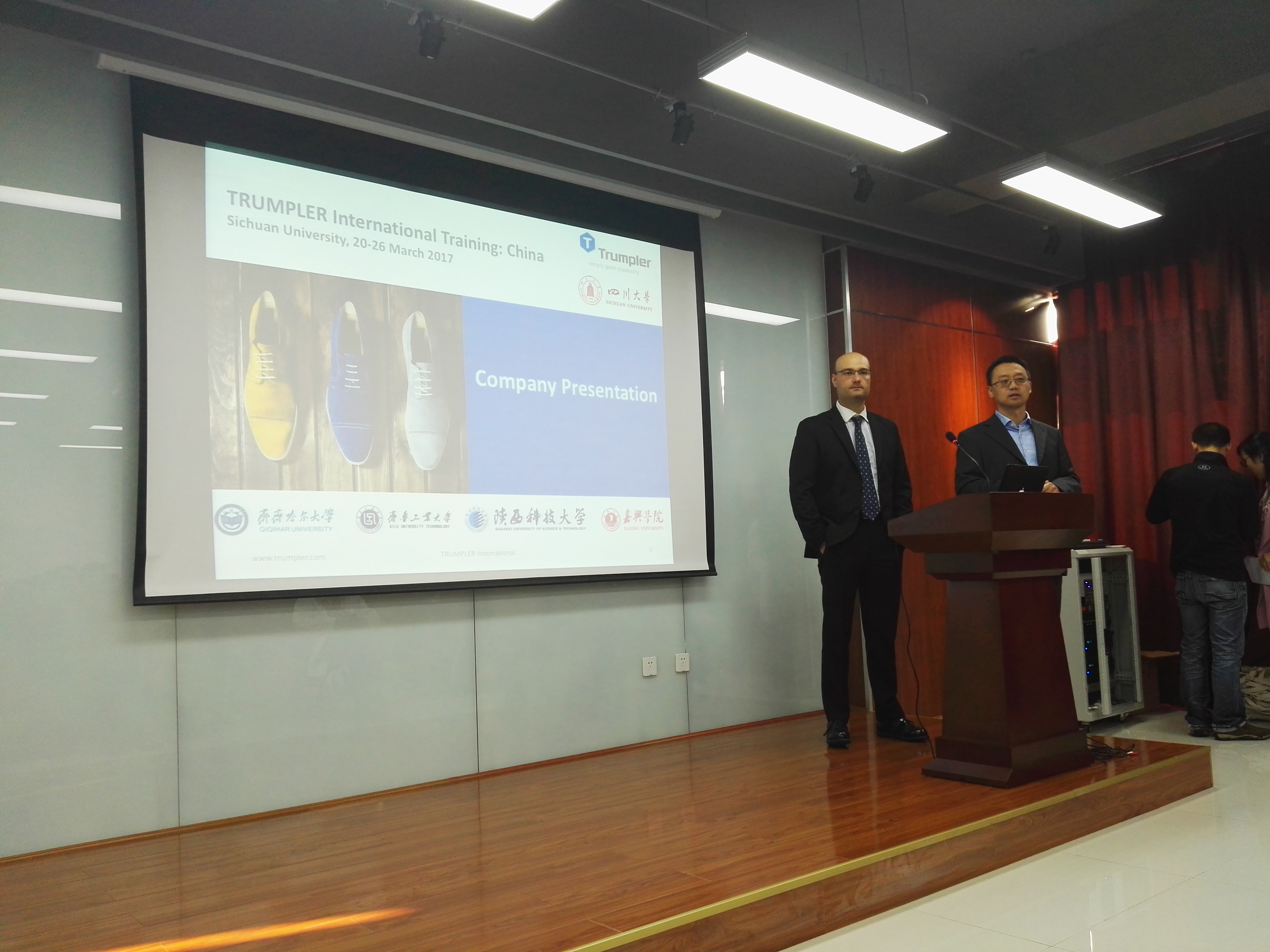 由汤普勒化工染料(嘉兴)有限公司与四川大学轻纺与食品学院联合举办的“汤普勒-四川大学制革技术培训班”于2017年3月20日在四川大学轻纺与食品学院生物质与皮革工程系开班。开班仪式于上午8:30在四川大学皮革楼二楼报告厅举行,开班仪式之后进行了“Open Lecture”。 出席开班仪式的TRUMPLER公司嘉宾有汤普勒中国总裁Mr.Joaquin Linzoain Acedo(西班牙籍)、汤普勒中国总裁张建维先生以及汤普勒德国、汤普勒西班牙以及汤普勒中国研发、推广和技术团队共计12人。