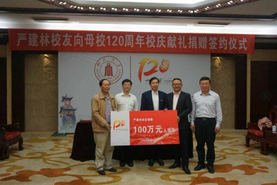 9月22日下午,严建林校友向四川大学120周年校庆献礼捐赠签约仪式在望江校区明德楼贵宾厅举行。四川大学校长谢和平院士、副校长李旭锋教授、副校级干部侯太平教授,四川省达威科技股份有限公司董事长严建林、公司总经办主任王光荣,以及学校校办、宣传部、外联办、轻纺与食品学院等单位负责人参加了签约仪式。仪式由侯太平教授主持。