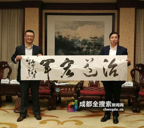 四川大学校长谢和平院士亲手书写了书法赠与陈治军。他表示,校友的捐赠,可以进一步给学校研究团队提供支撑,尤其是创业校友,更有互补共赢性。他还透露,日后川大可以和徐州联合起来,达成校市合作协议,推动大学和地方产业之间的联系。