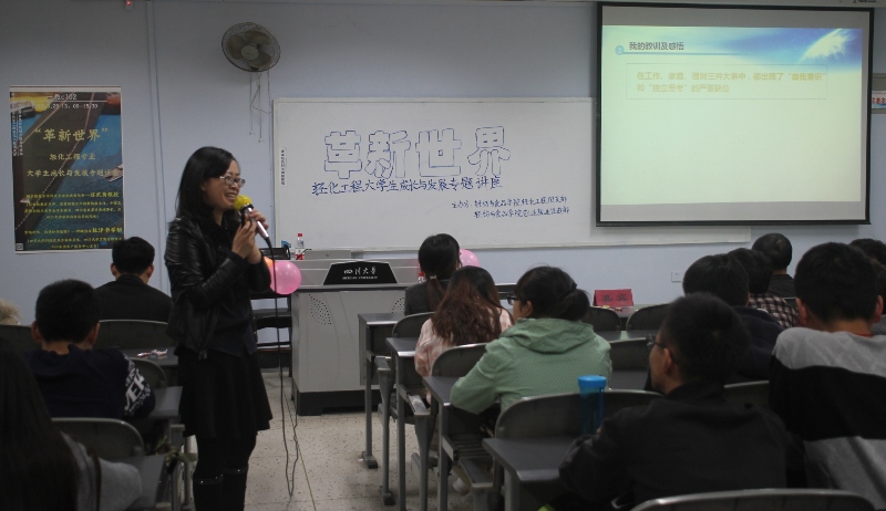 2016年3月25日,“革新世界”轻化工程专业大学生成长与发展专题讲座在江安校区第一教学楼C座102教室顺利举办。出席本次讲座的嘉宾有国家级教学名师、教育部轻化工程教指委主任、中国皮革协会技术委员会常务委员、四川省皮革学会理事长、原四川大学轻纺与食品学院院长陈武勇教授,四川大学91级皮革工程专业校友、四川大学工商管理学士、AEC集团客户服务中心主管杜泽书女士,轻纺与食品学院生物质与皮革工程系副系主任林炜教授,以及轻纺与食品学院团委副书记、2015级辅导员贺婷老师。轻化工程专业14级部分学生和15级全体学生参加了本次讲座。