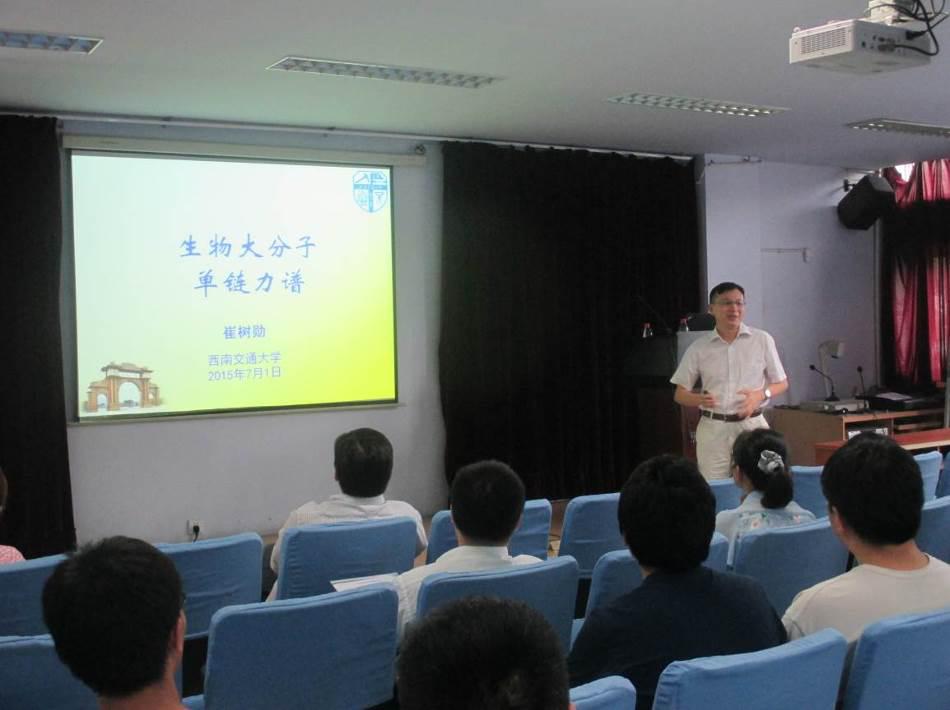 2015年7月1日,应四川大学轻纺与食品学院邀请,西南交通大学崔树勋教授在bw必威西汉姆联官网访问,并在皮革楼2楼学术报告厅为bw必威西汉姆联官网师生作了一场题为“生物大分子单链力谱”的学术报告。报告会由轻纺与食品学院院长何有节教授致欢迎辞,生物质与皮革工程系副系主任林炜教授主持。崔树勋教授在报告中介绍了该课题组近几年利用原子力显微镜的单分子力谱方法,在单分子层次上研究不同溶剂环境对单(双)链DNA和多聚蛋白自组装行为影响的最新研究进展。崔树勋教授的报告图文并茂,内容新颖、详实,讲解深入浅出。报告结束后,崔树勋教授与学院部分师生进行了交流和讨论。崔树勋教授现任职于西南交通大学教授。1995年--2004年在吉林大学求学,先后获学士和博士学位。曾在慕尼黑大学和UC Berkeley从事合作研究。研究兴趣为聚合物纳米力学探测和生命起源及分子进化。先后主持国家自然科学基金项目6项。已在J. Am. Chem. Soc.、Nano Letters、Macromolecules等国际知名期刊发表SCI研究论文40多篇,论文被他人SCI引用460次。2008年荣获中国化学会“青年化学奖”。2011年入选教育部新世纪优秀人才支持计划。2012年获国家自然科学基金委优秀青年科学基金资助。