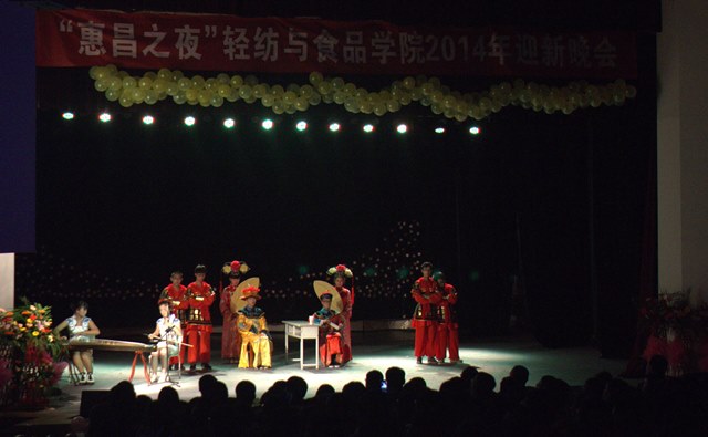 何有节院长发表了热情洋溢的致辞。何院长对轻纺与食品学院2014级新同学的到来表示了热烈的欢迎和深情的祝愿,对支持本台晚会的广东皮革校友会倪建荣先生和组织晚会的工作人员致以衷心的感谢,并预祝本次晚会取得圆满成功。展现出2014级同学们对大学生活的无限热情的风采展示视频拉开了晚会的帷幕。伴随着强劲的鼓点,晚会在充满激情的开场歌舞《BAR BAR BAR》《青苹果乐园》《歌舞青春》中正式开始,欢快的舞步和歌声迅速将现场带入热烈的氛围中。形式丰富多彩的节目为所有观众呈现了一场视听的盛宴。古典舞《丽人行韵》柔美动人,清新脱俗。搞怪的《爱笑后宫传》和《灰姑娘》让现场不时爆发出欢笑。一曲悠扬婉转的《青花瓷》应和自如流畅的现场书法表演展现了充满古典气息的东方神韵。话剧《霸王别姬》以幽默与严肃并存的方式娓娓诉说了一个荡气回肠的故事。妩媚妖娆的爵士舞《一分一秒》瞬间点燃现场的气氛。院团委学生会带来的舞蹈串烧也引发了阵阵欢呼。皮影协会用民族传统艺术与现代音乐结合的方式带来了一场别开生面的精彩表演,模特协会紧随其后为大家送上一台精彩的走秀。压轴出场的老师们的走秀引爆全场,台下热烈的欢呼和掌声一浪高过一浪。整场晚会精彩不断、高潮迭起。现场的同学们也通过人人墙分享了自己的感想,为现场的气氛更添一分热度。晚会尾声,院领导为近期过生日的同学们送上了真诚的生日祝福,并为这些同学送上了高年级食品科学与工程专业同学们亲手制作的生日蛋糕。至此,“惠昌之夜”轻纺与食品学院2014年迎新晚会在温暖的氛围中完美落幕。