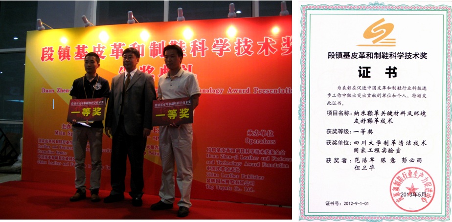 5月15日,第五届“段镇基皮革和制鞋科学技术奖”揭晓,四川大学制革清洁技术国家工程实验室范浩军、陈意、彭必雨、但卫华等教授完成的国家863项目《纳米鞣革关键材料及环境友好鞣革技术》荣获一等奖,结束了该奖项自2005年设立以来一等奖连续四届空缺的历史。该项目针对传统铬鞣法长期面临的环境生态瓶颈问题,首次提出了全新的纳米鞣革理念和鞣革方法,获得了可以在部分皮革生产中完全取代铬鞣的纳米鞣革清洁生产集成技术并成功应用于实际生产,社会经济效益显著;所涉及的纳米鞣剂制备方法、纳米鞣革方法及纳米鞣革集成工艺技术属国内外首创。
