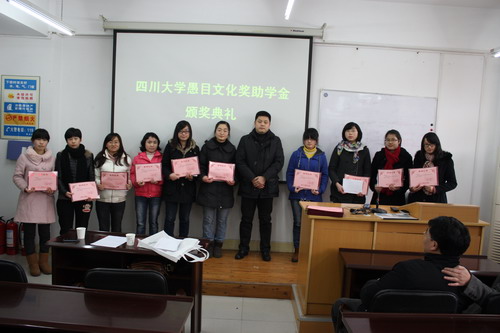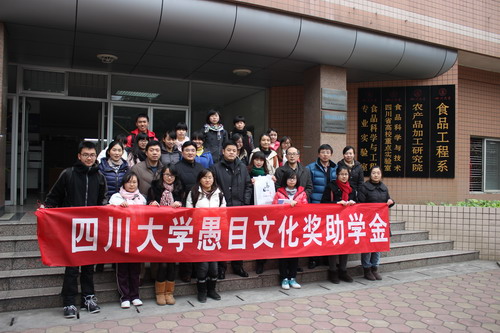 2012年12月28日中午1点,2012年度四川大学愚目文化奖助学金颁发仪式在食品工程系纺工楼202多媒体教室顺利举行,参加颁发仪式的有成都愚目文化传播公司周志明总经理,轻纺与食品学院副院长、食品工程系系主任何强教授,院党委副书记刘晓虎副教授,团委书记苏德强老师,2010级辅导员段飞霞老师,食品工程系邹华雄老师以及食品科学与工程专业全体获奖学生。颁奖典礼由院党委副书记刘晓虎主持。