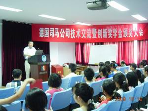 2009年6月22日下午14:30,司马公司技术交流暨创新奖学金颁奖大会在皮革楼报告厅隆重举行。参加本次颁奖典礼的嘉宾有德国司马首席代表、皮革部中国区张建华经理、皮革部技术代表宋在健先生;轻纺与食品学院副院长何有节教授;轻纺与食品学院团委副书记冯国涛老师及2006级生物质与皮革工程系本科生参加。颁奖大会由王坤余教授主持。 颁奖典礼开始时,何有节教授首先代表学院致辞,对司马公司长期以来对四川大学的支持与关注,在我校设立奖学金表示衷心的感谢,对我校杰出校友能在百忙之中回到母校表示热烈的欢迎,并期望与同学们有深入细致的交流。司马公司特别注重支持我国的皮革、毛皮教育事业和创新人才培养,已与四川大学轻纺与食品学院建立了良好的合作关系。2008年司马化学有限公司在四川大学设立了“四川大学—德国司马创新奖学金”,这个奖学金是行业、企业首次为四川大学大三大四本科生进行科研创新实践而设立的,目的是鼓励四川大学轻纺与食品学院生物质与皮革工程系学生创新成才,加强动手能力、培养高水平学生。此次张总一行到我校还有的重要工作是对获得资助项目进行中期检查。随后,张建华经理代表司马公司对本次获得奖学金的同学表示祝贺,并勉励大家以此为新的起点,争取明年取得更加优异的成绩。冯国涛老师宣布了获奖名单,并邀请张经理为获得首届司马创新奖学金的同学代表颁发了证书。颁奖典礼结束后,宋在健先生还向正在参加生产实习的大三同学介绍了本公司的特色产品,对同学们正确的选择、使用材料,更深入的认识、理解皮革生产过程奠定了基础。(billows)生物质与皮革工程系2009年6月26日