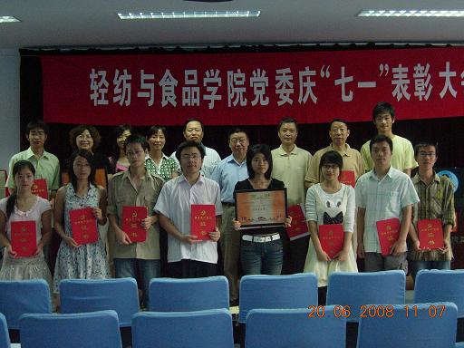 轻纺与食品学院党委召开庆“七一”暨表彰大会 2008年6月20日,中共四川大学轻纺与食品学院委员会召开庆“七一”暨表彰大会。党委书记刘学文教授讲话,对广大党员在学院的各项工作中起到了模范作用,希望党员同志继续为学院的发展和建设做出贡献。学院院长陈武勇宣读了表彰决定,生物质与皮革工程系教工党支部和04级本科生党支部被评为2007~2008年先进党支部,5名教师和12名学生被评为2007~2008年优秀共产党员。
