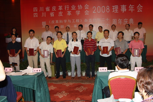 四川省皮革学会2008理事年会暨《皮革科学与工程》杂志创刊二十周年庆典隆重召开 2008年8月25日,四川峨眉山红珠山宾馆彩球飞舞、人头攒动,四川省皮革行业协会、四川省皮革学会2008理事年会暨《皮革科学与工程》创刊二十周年、《西部皮革》创刊三十周年庆典在此拉开帷幕,来自省内外的100余名行业有关领导及高等院校、企业界代表云集于此,抚今追昔,探寻行业低谷中蕴藏的机遇和加速前行的道路。这次会议原定于2008年5月14~15日召开,因5.12汶川大地震被迫延后至今。这次会议的召开标志着四川皮革行业已经从举世震惊的地震阴影中走出来,开始寻求重建和发展的良机。在会上,中国皮革协会副理事长李玉中、四川省经委轻纺处副处长方建程、省民政厅民管局调研员罗伯益、省科协学会部副部长李晋等主管部门领导负责同志作了报告和发言。四川省皮革学会陈武勇理事长、四川省皮革行业协会皮化分会李正军秘书长、《皮革科学与工程》杂志廖隆理主编、《西部皮革》杂志李开华主编分别在大会上作了工作报告。皮革化学与工程教育部重点实验室主任石碧教授、陕西科技大学资源与环境学院院长王学川教授、中国皮革工业信息中心谢衡总编、中国皮革和制鞋工业研究院高忠柏高工及行业知名老专家张扬教授、吴永声教授、魏德卿研究员、吕绪庸教授、陆文炳高工等出席了会议。四川大学单志华教授和陕西科大王学川教授在大会上作了学术报告。 广大编委和作者在两刊长期办刊过程中,给予了大力支持与帮助,为刊物撰写了大量有价值的高水平论文。省内、外皮革企业长期以来对两刊工作给予了大力支持。为表彰和鼓励他们所作的成绩与贡献,本次会议评选颁发了“盛汇杯”两刊优秀编委奖、优秀论文奖和皮革行业公益事业突出贡献奖。10名获得优秀编委奖的是:魏德卿、吴兴赤、王学川、陆文炳、兰云军、吕生华、廖学品、李国英、范浩军、王全杰;10篇优秀论文是:丙烯酸树脂处理不浸酸铬鞣在绵羊鞋面革中的应用研究(张涛,潘科锦,张长春,陈武勇)、丙烯酸树脂/纳米SiO2复合涂饰剂中的合成研究(马建中,张志杰,刘凌云)、深色皮革中铬(VI)含量的测定(段悟吾,陈敏,李志强)、脂肪族水性聚氨酯涂饰的研制(田伟,王芳,汤克勇,王全杰)、马占相思栲胶的性质与应用研究(梁发星,颜秀珍,谭晓勉,黄建修,石碧)、中国皮革科技史话讲座(吕绪庸 吕欣)、无盐浸酸高吸收铬鞣方法的研究(王鸿儒,王瑞瑞,楼建新,魏鹏勃)、毛革两用绵羊皮脱脂工艺研究(程海明,陈敏,廖隆理,李志强)、依托特色优势,发展四川皮革产业(但卫华,曾睿,但年华,林海,陈驰等)、乙烯基类单体改性VAE皮革涂饰剂的合成与应用(刘白玲,罗荣,刘宗惠,陈华林)。荣获皮革行业公益事业突出贡献奖的单位有:成都中科高分子材料股份有限公司、成都岚牌实业有限责任公司、四川奥星生物技术有限公司、广东盛方化工有限公司、四川乐山振静皮革制品有限公司、四川德赛尔化工实业有限公司、四川亭江精细化工有限公司、浙江盛汇化工有限公司、四川川化集团成都望江化工厂皮化分厂、成都官氏贸易发展有限公司。 会议进行了经济技术信息互动交流,绝大部分与会代表在会上发表了意见。本次会议的各项议题均紧紧围绕着行业树信心、抓机遇,调整转型寻求发展的中心议题。