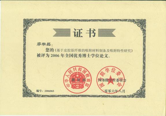 bw必威西汉姆联官网石碧教授指导的廖学品博士论文“基于皮胶原纤维的吸附材料制备及吸附特性研究”被评为2006年全国百篇优秀博士论文。该论文创造性的以皮胶原纤维为基础材料,制备出了两类具有重要应用前景的新型吸附材料,分别用于中草药制剂中单宁的高选择性脱除和水体中有毒重金属离子的去除。研究工作拓展了皮革化学与工程学科的研究方向,为皮胶原这一丰富的可再生资源的开发利用提供了新的方法,得到国际同行的认可。在博士论文研究期间发表SCI收录论文11篇,获得国家发明专利2项。