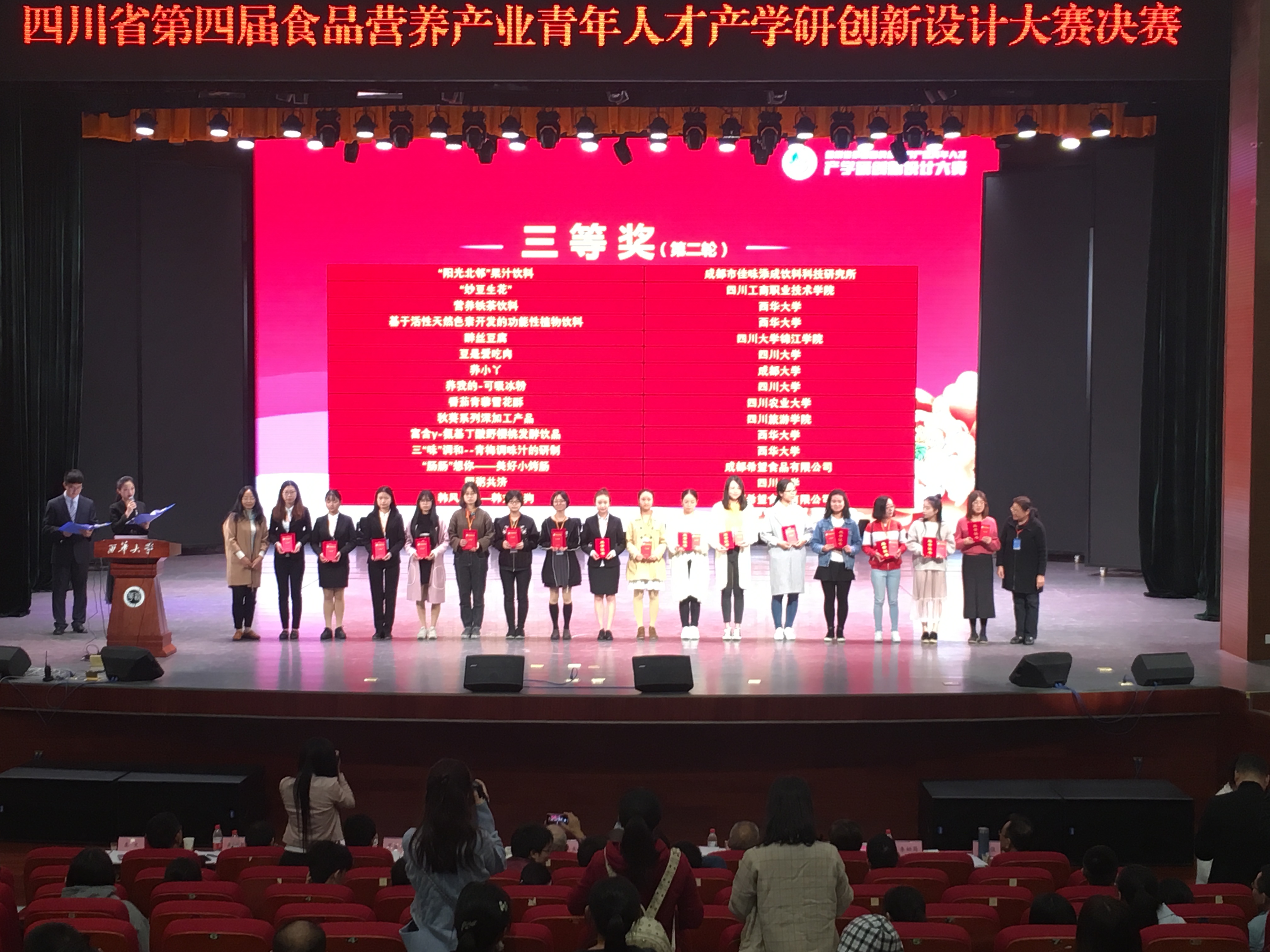 为激发青年人才对食品新产品创意、研究、开发的热情,促进食品与营养相关领域的创新人才成长,由四川省食品科学技术学会、四川省营养学会主办;中国科学技术协会、四川省科学技术协会指导;四川大学、西华大学承办的2018“四川省第四届食品营养产业青年人才产学研创新设计大赛”于2018年10月13日至14日在西华大学顺利举办,圆满落幕。本次大赛也被列入2018“大众创业,万众创新”全国双创周四川预热项目。