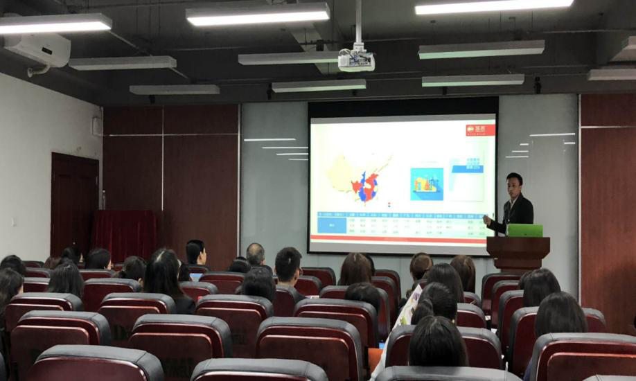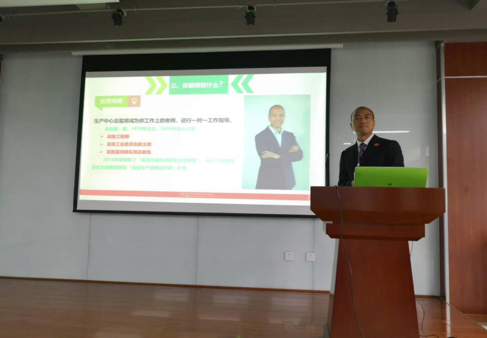 生产部总监吴世明先生通过对行业前景、生产中心简介、学习和收获、成长平台和发展方向4个维度详细深入的讲解,让同学们全方面的了解了圣恩生产部的情况、产业发展上所取得的成就和广阔发展前景,求贤若渴的诚挚之情点燃了在场学子的激情。