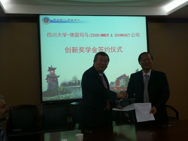张建华总经理和何有节院长分别代表司校企双发在“德国司马化学(ZSCHIMMER & SCHWARZ)有限公司与四川大学轻纺与食品学院合作协议书”上签字,并相互致贺。自2008年起司马公司在四川大学皮革系设立“司马创新奖学金”,至今已有十年,累计资助了100多位研究生、本科生、成教生开展科研创新。