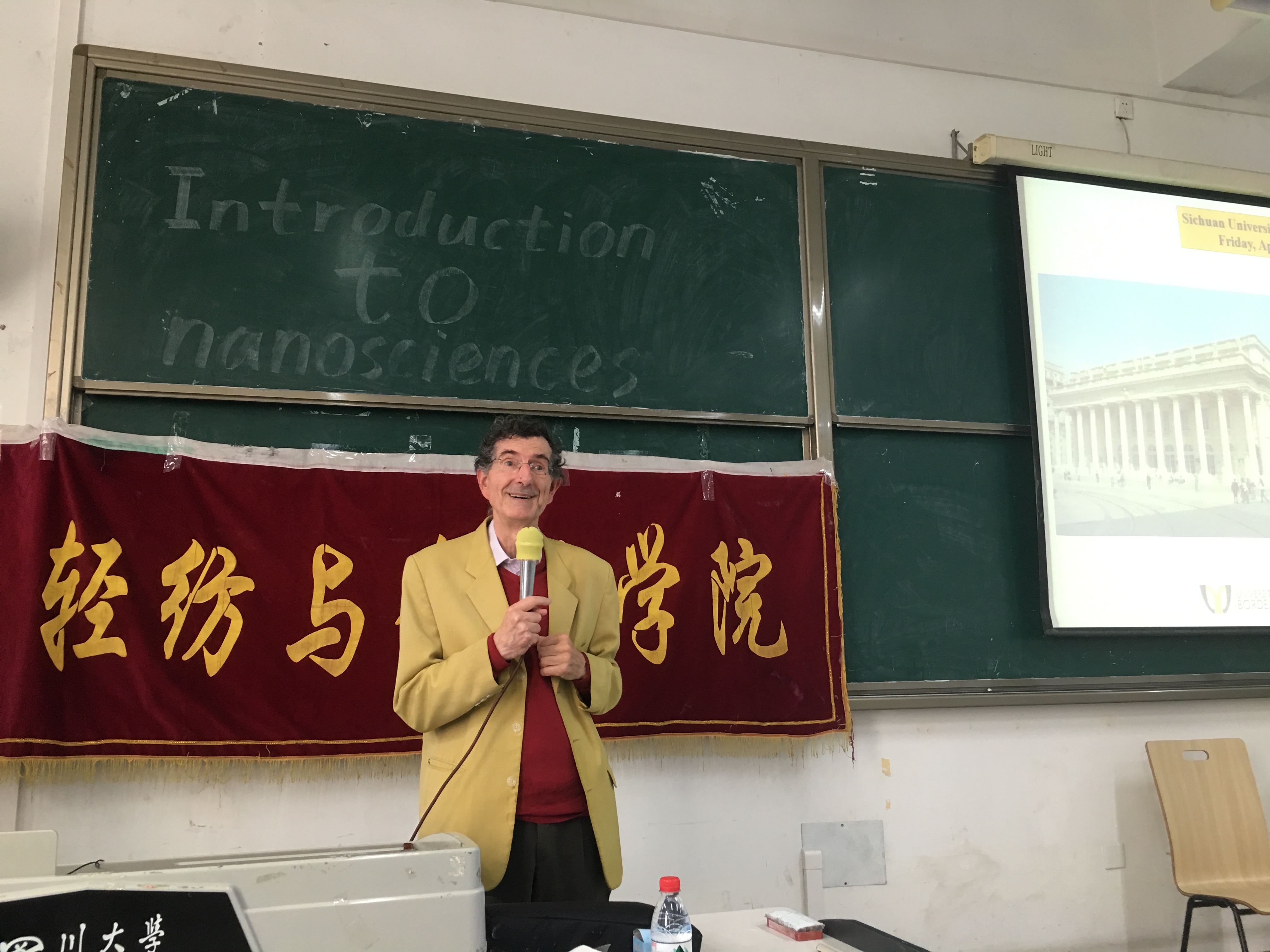 随后,教授通过世界顶尖学术杂志的介绍,强调纳米技术的重要性。Didier 院士在纳米技术研究领域具有非凡的造诣,清晰明了的介绍纳米材料的多种形式和各自的独特。在讲座中Didier 院士着重介绍金纳米粒子和其他纳米材料所不同的结构和广泛的应用。幽默生动的讲解,配上Didier 院士和善的笑容,大家对金纳米粒子有了深刻印象。此时,Didier 院士又为大家介绍了金纳米粒子的应用,在医学、生物和生活等方面的广泛的使用,详细的描述让大家沉迷。最后进行了提问环节,教授对同学们都关心的科研道路的问题进行多层次的对比分析,让大家心里对科研道路有了更深的认识。