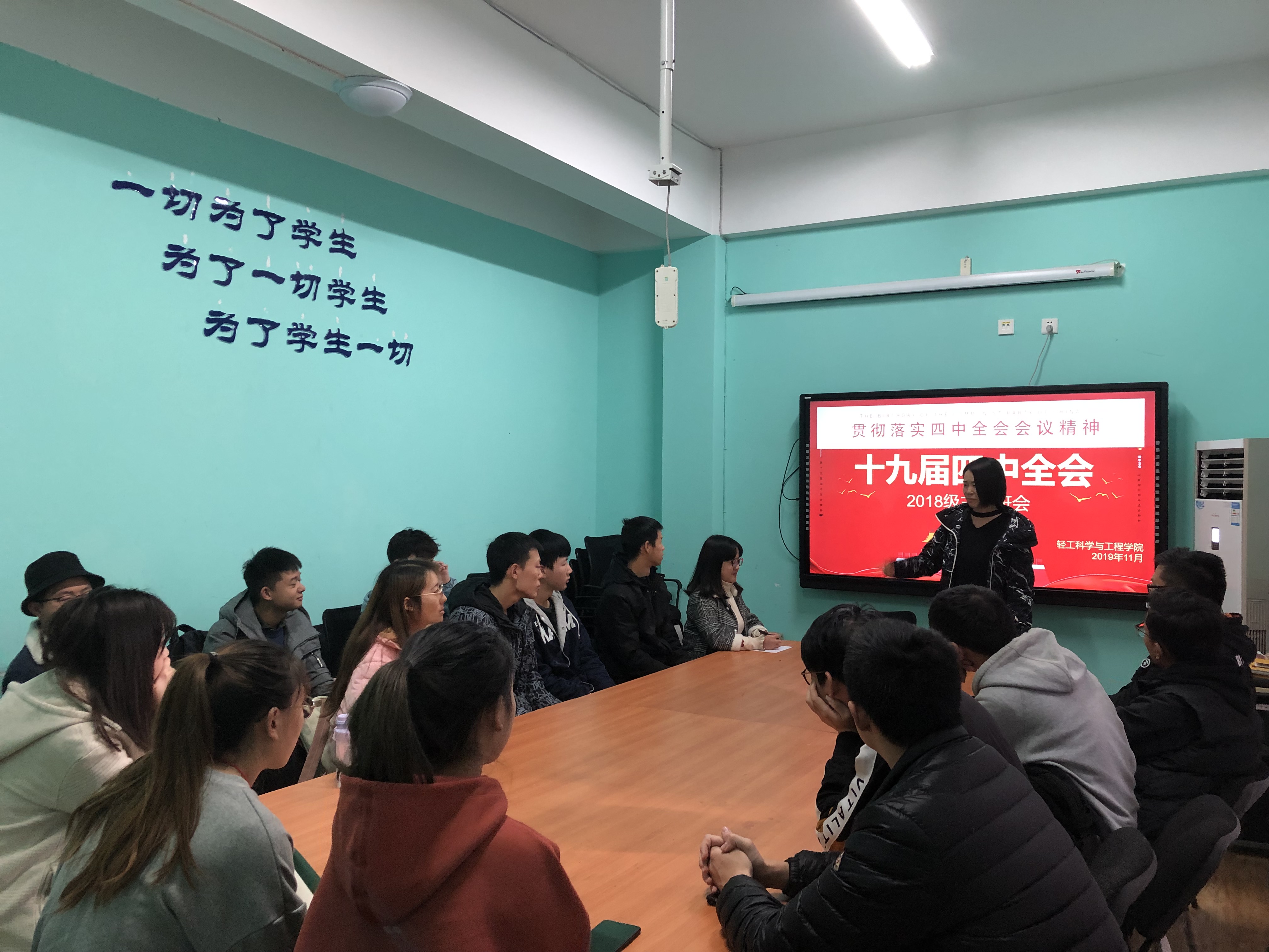 在主题班会活动中,辅导员杨维老师从6个方面讲解,让同学们能够深入理解十九届四中全会精神,希望同学们联系实际,在学习和生活中贯彻十九届四中全会精神。在杨老师讲解完毕后,同学们踊跃发言,分享了“中国之治”在法治、民主、脱贫、高铁发展、乡村建设、生态文明建设等方面的新的境界。