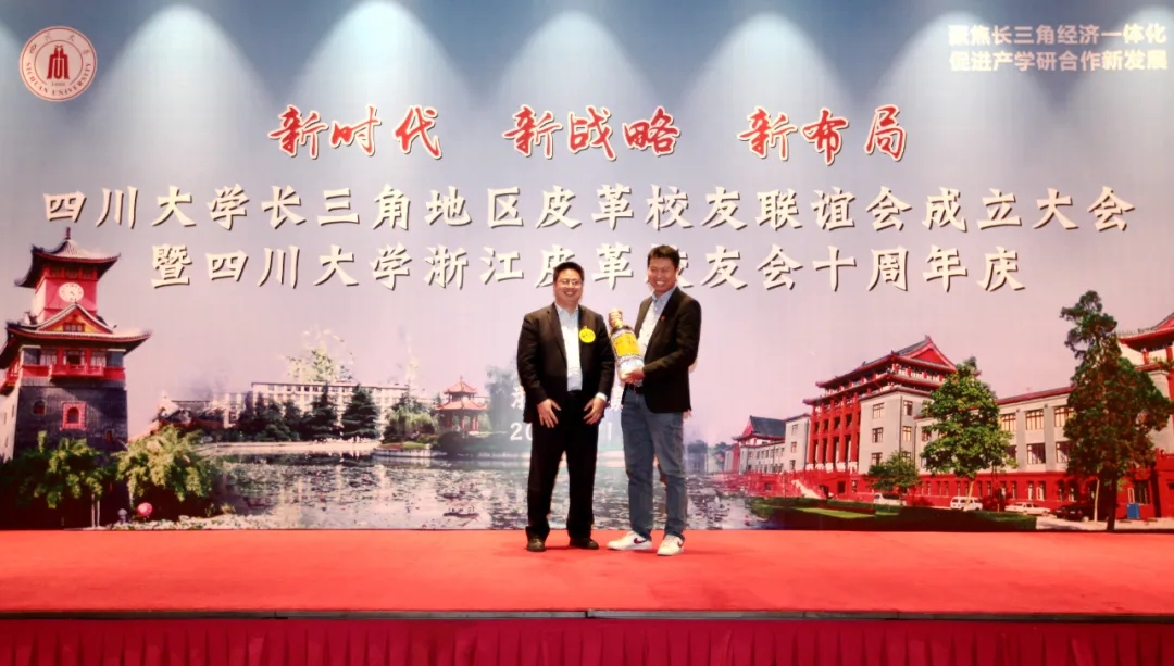 四川大学河北校友会会长孙晓刚代表河北校友会、河北皮革校友会向长三角皮革校友会赠送礼物