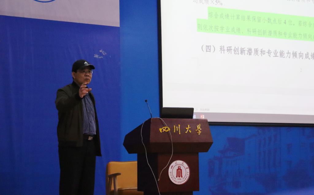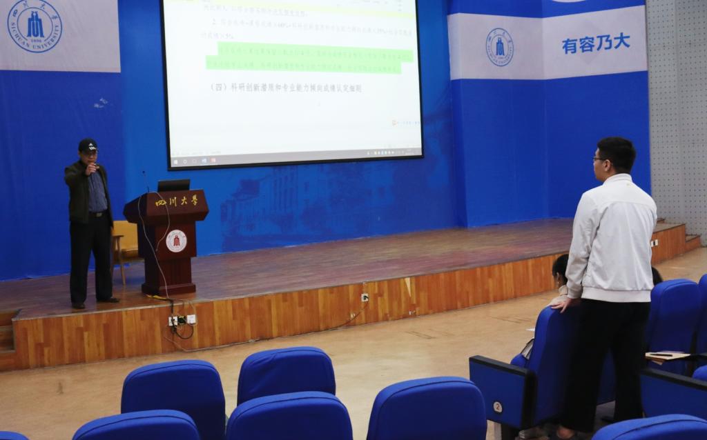 会议开始,彭必雨教授首先提出如何高质量度过大学四年的生涯发展命题,并针对大一、大二学生当前表现出的没有找到适合大学的学习方法与学习目标不明确的两个主要问题给出三点建议:第一,通过平时生活中的行为细节养成积极主动的学习习惯,比如上课主动坐前排,学习主动与任课老师沟通等;第二,在习惯了中学全方位无死角的高压灌输式教育模式后,尽快从中学的学习方法中走出,找到适合大学的学习方法;第三,作为川大学子,不能只是为了就业而上学,要努力成为国家的精英型人才,尽早树立深造目标,并合理做好深造规划。