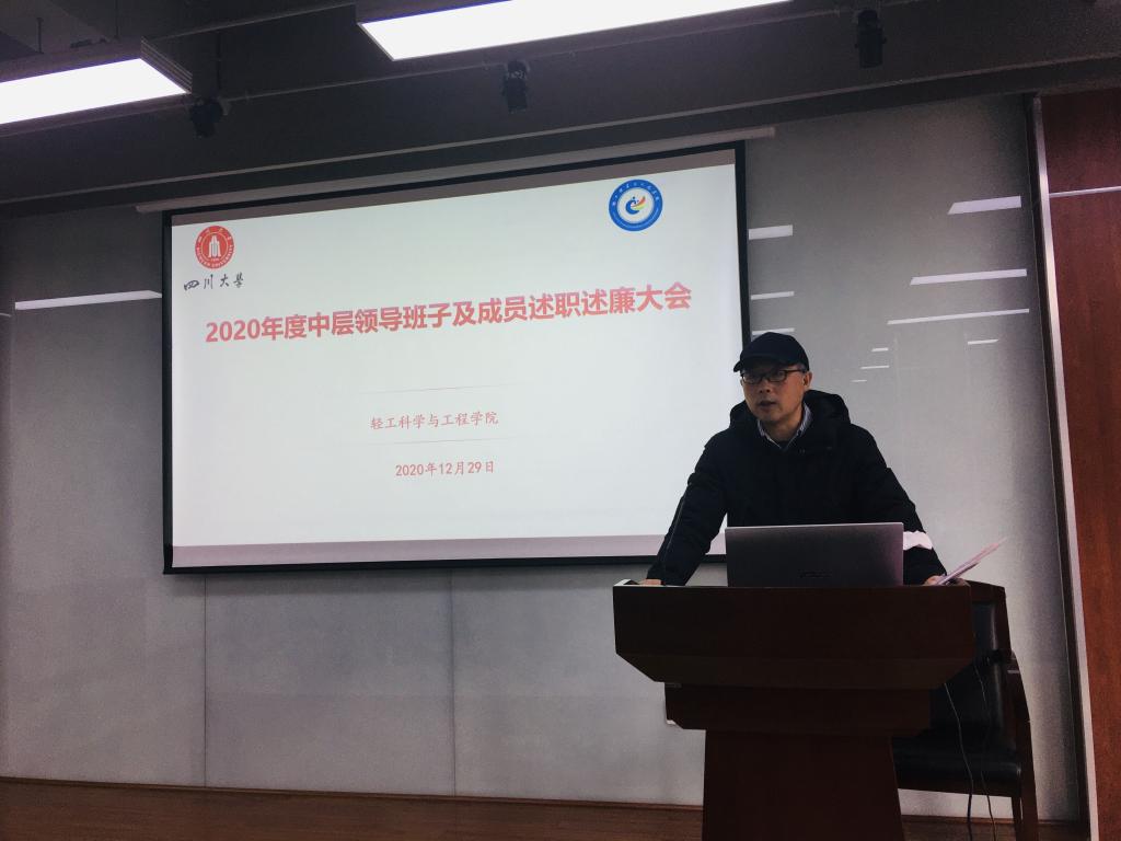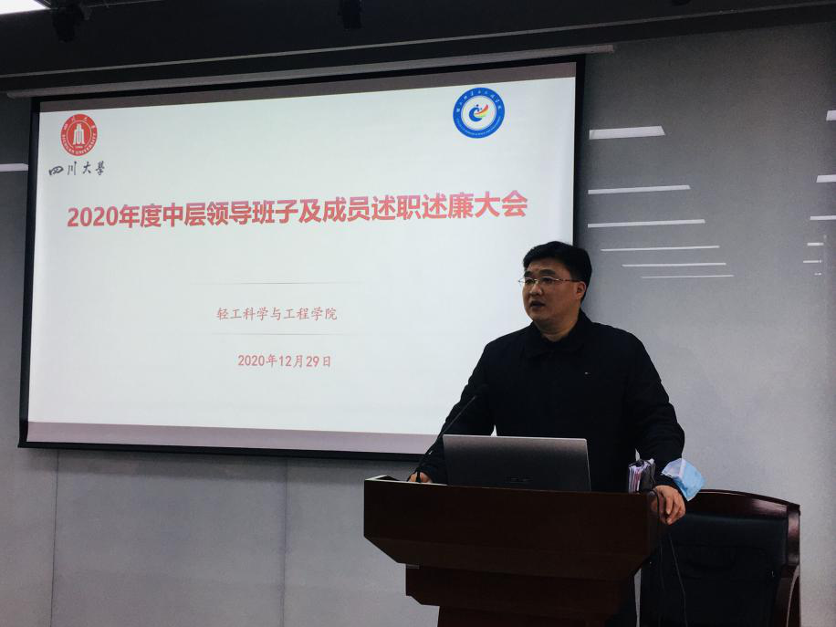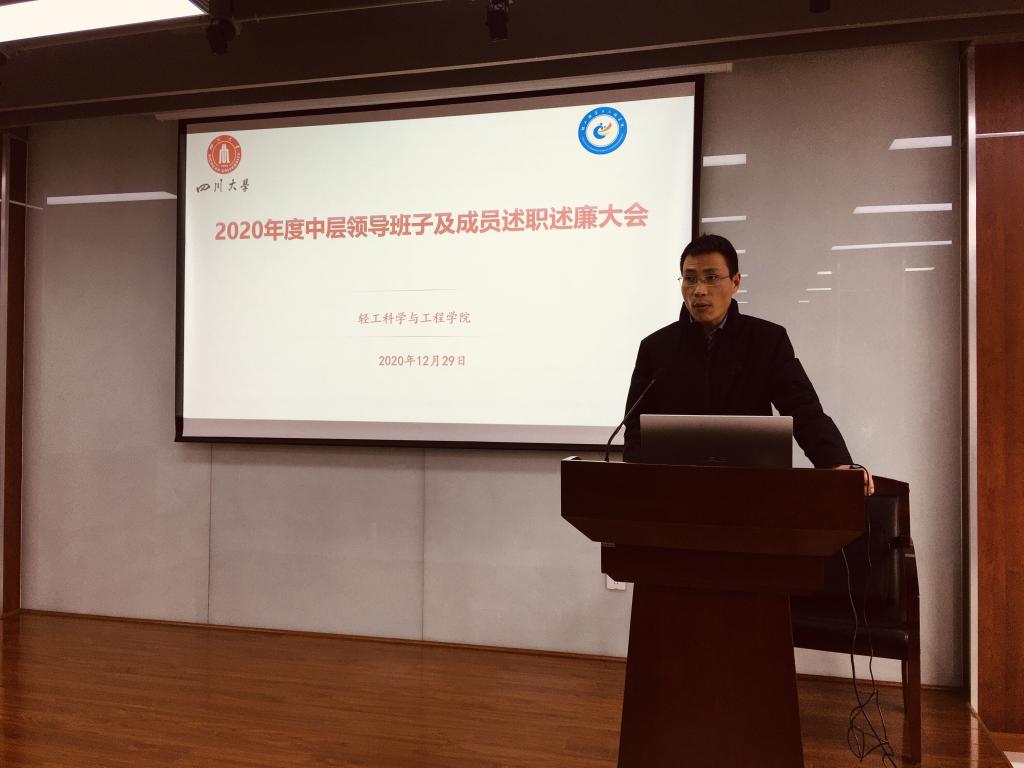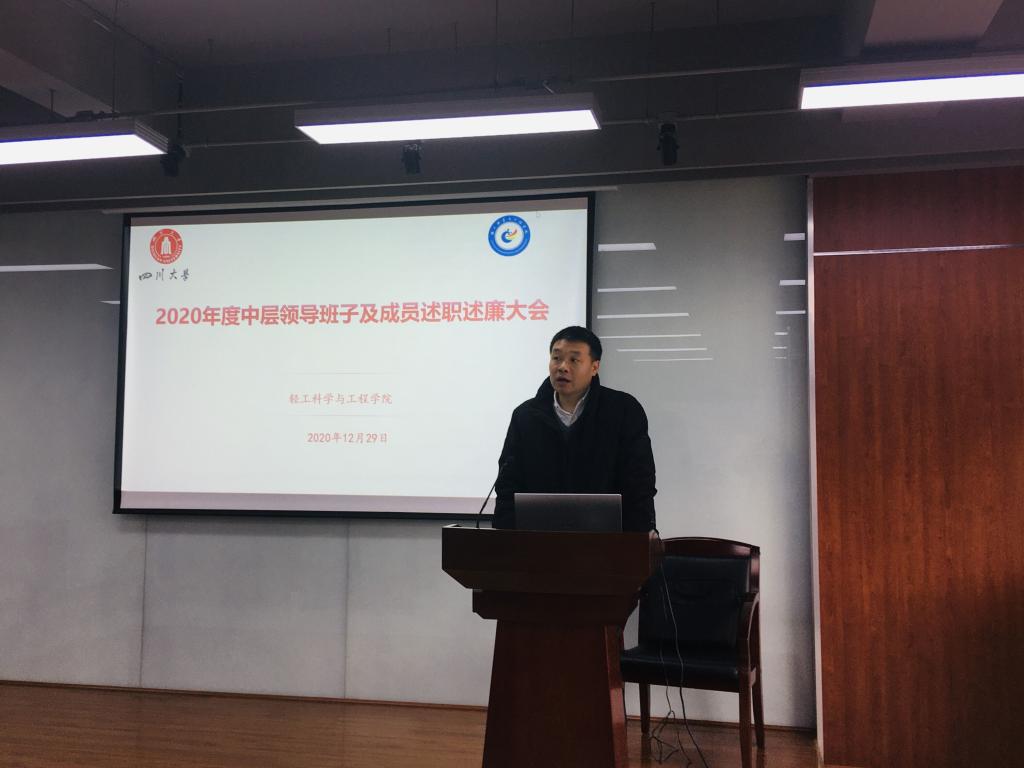 2020年12月29日上午,bw必威西汉姆联官网在皮革楼215报告厅,召开学院领导班子及成员2020年度述职述廉暨民主测评大会。大会由学院党委书记刘晓虎主持,全院教职员工参会。