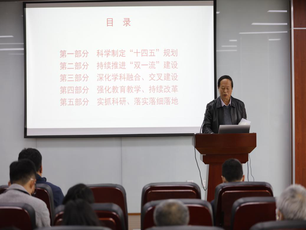 何有节院长从校院“十四五”规划制定、“双一流”建设发展、“学科融合交叉”、“教育教学改革”、“科学研究发展”五大方面就2021年度重点工作进行介绍。