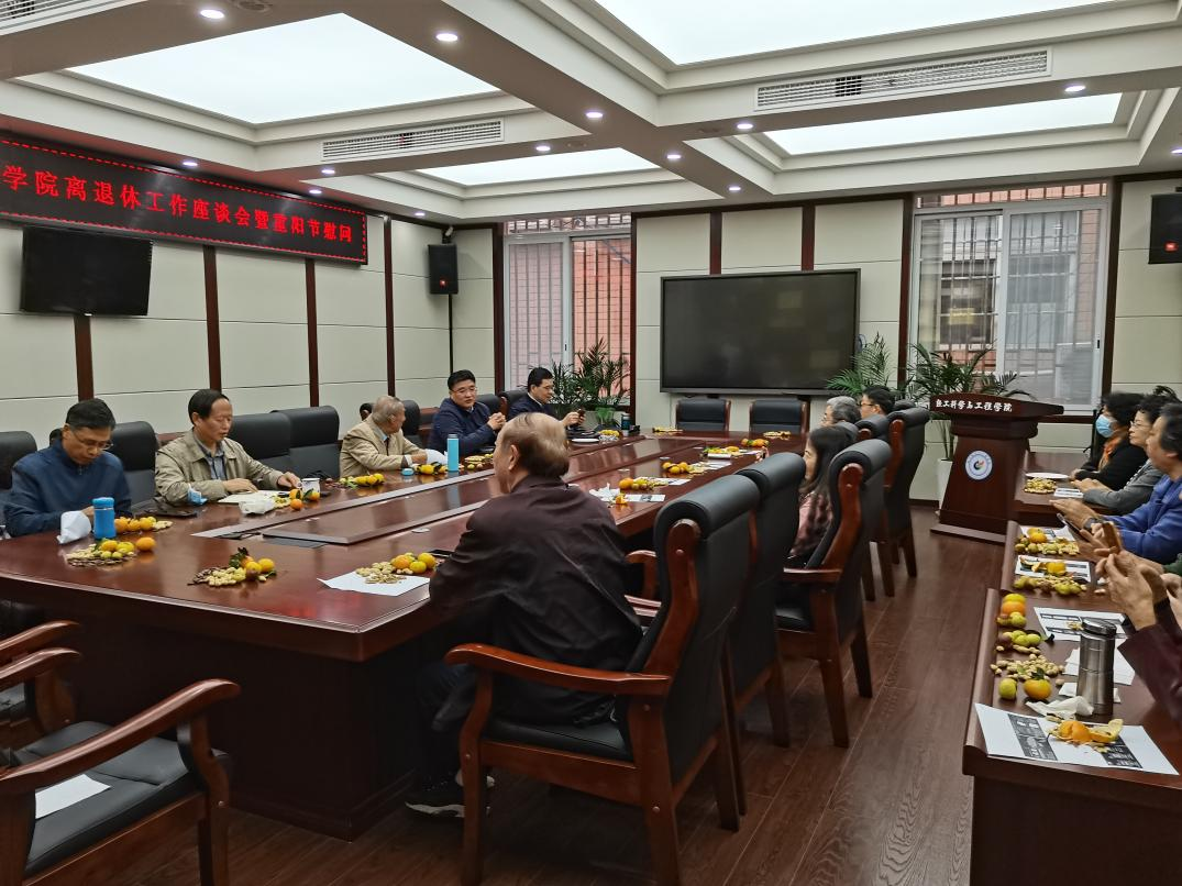 2021年10月14日,学院在纺工附楼205会议室召开离退休教职工座谈暨重阳节慰问会。刘晓虎书记、何有节院长、彭必雨副院长、何强副院长、党政办李慧主任、离退休教职工等参加本次会议。会议由刘晓虎书记主持。