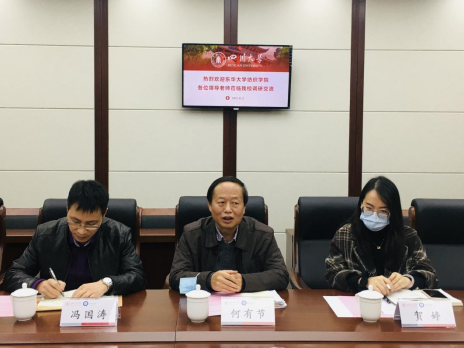 冯国涛副书记向陈书记一行人员介绍了学院学生工作整体情况。同时,陈书记也围绕东华大学纺织学院学生规模、学生工作建设等方面展开介绍。随后,双方老师重点就创新人才培养方式方法、学生党建工作品牌打造、学生学风建设、辅导员及班主任队伍建设等方面进行广泛而深入交流。