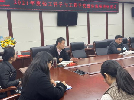 刘晓虎书记首先向两位退休教师介绍了学院发展现状以及所取得的成果,并回顾了学院发展过程中历辈轻工人的艰辛足迹,尤其对两位退休教师做出的突出贡献表示由衷感谢,希望两位教师保重身体,继续关心学院的建设与发展,祝福他们晚年生活幸福安康。