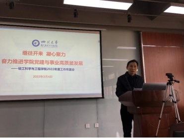 2022年3月4日下午,学院召开以“继往开来、凝心聚力,奋力推进学院党建与事业高质量发展”为主题的全院教职工大会,传达学校“双代会”暨2022年度工作布置会相关内容以及安排部署本年度工作。按疫情防控要求,本次会议采取主会场与分会场相结合的方式召开,学院领导班子、生物质与皮革工程系教师在皮革楼215报告厅主会场参会;食品工程系、服装与服饰设计系、纺研所教师以及学院公共服务体系教师分别在纺工附楼205会议室与皮革楼209会议室两个分会场参会。本次会议由李天富书记主持。