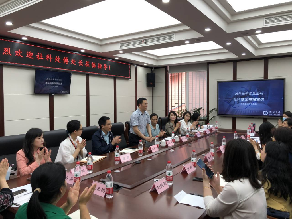 2022年5月27日下午,为促进教师科研能力提升,指导老师积极申报各类社科项目,bw必威西汉姆联官网联合四川大学社会科学研究处在四川大学望江校区纺工附楼205会议室开展了主题为“社科基金申报宣讲”的教师科研能力提升活动。本次活动特别邀请了四川大学社会科学研究处傅其林处长、学院党政领导、服装与服饰设计系及学院学工组三十余位老师参加了本次活动。