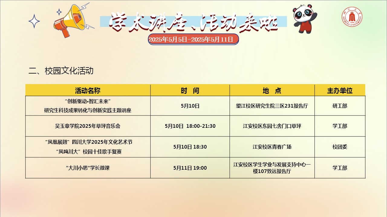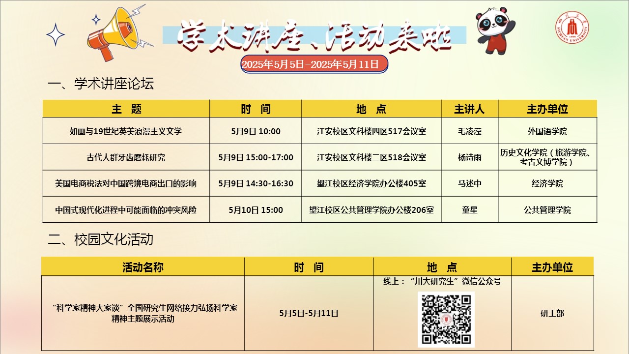 学术讲座论坛及校园文化活动预告(2025年5月5日-2025年5月11日)
